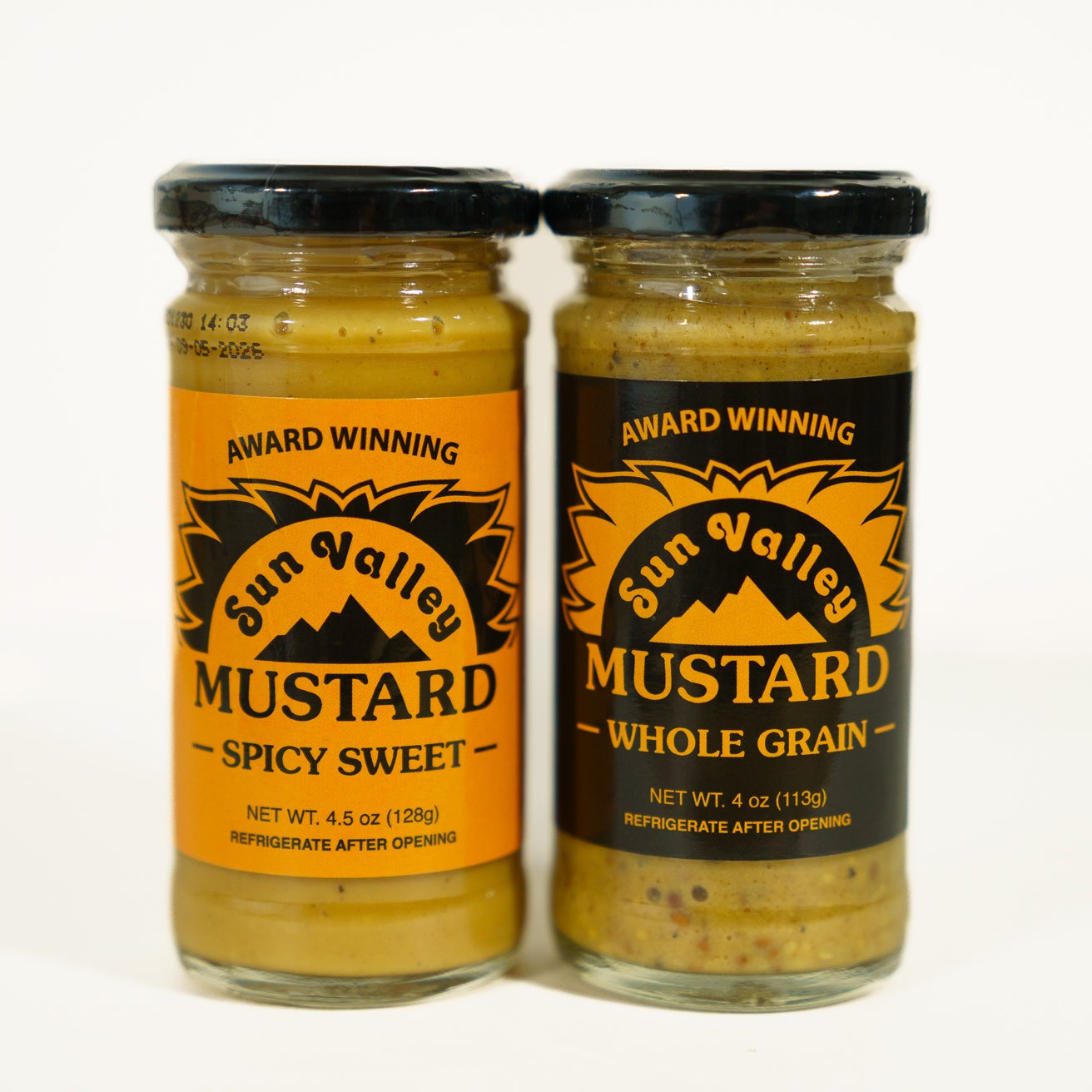 This variety tube contains one 4.5 ounce jar of our spicy sweet mustard and one 4 ounce jar of our whole grain mustard.